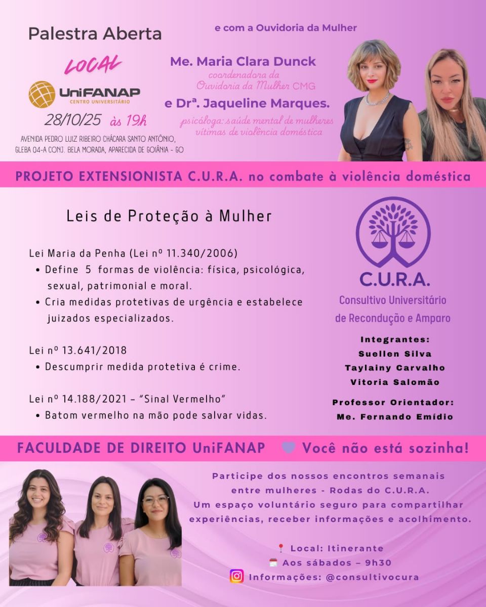 Venha participar de uma importante palestra no anfiteatro do Centro Universitário UniFANAP, em Aparecida de Goiânia, para saber mais sobre políticas públicas e direitos das mulheres com a reconhecida socióloga, vereadora Aava Santiago, juntamente ao Nudem (Núcleo Especializado de Defesa e Promoção dos Direitos da Mulher) da Defensoria Pública do Estado de Goiás, que será representada pela assessora do Nudem, Dra. Maria Alice Santos.