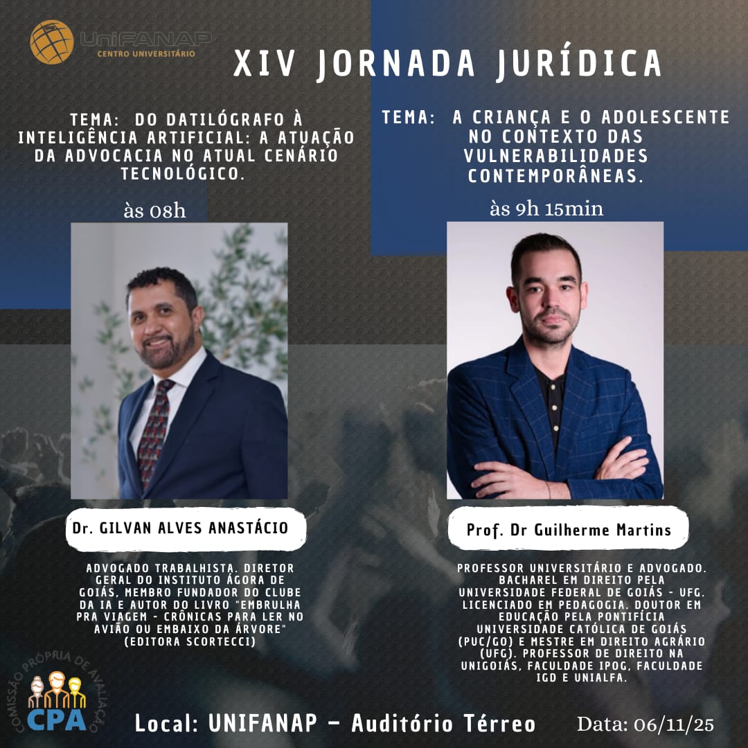 O curso de Direito do UniFANAP realizará, no dia 6 de novembro de 2025, a XIV Jornada Jurídica. As palestras ocorrerão nos períodos matutino e noturno, oferecendo uma oportunidade ímpar para debater temas atuais e promover a integração entre acadêmicos e profissionais da área do Direito.