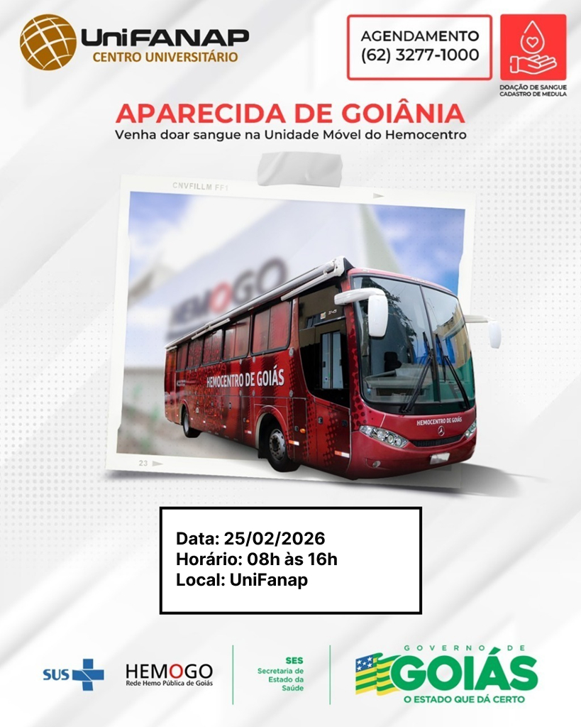 O UniFANAP e o Hemocentro de Goiás estão promovendo uma campanha de doação de sangue no dia 25 de fevereiro, das 08h às 16h, na sede do UniFANAP.