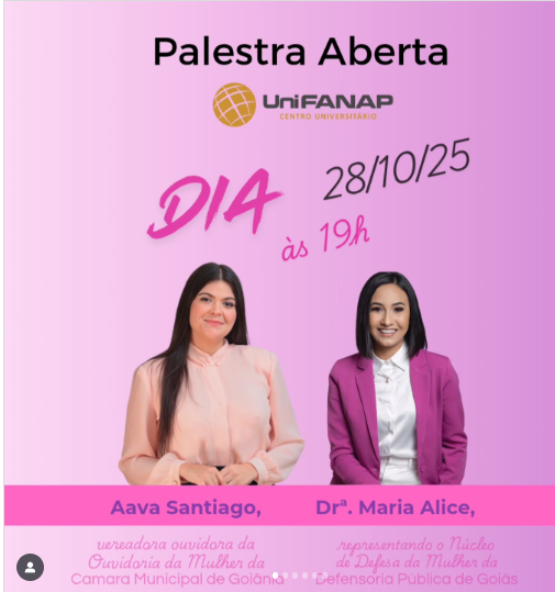 Venha participar de uma importante palestra no anfiteatro do Centro Universitário UniFANAP, em Aparecida de Goiânia, para saber mais sobre políticas públicas e direitos das mulheres com a reconhecida socióloga, vereadora Aava Santiago, juntamente ao Nudem (Núcleo Especializado de Defesa e Promoção dos Direitos da Mulher) da Defensoria Pública do Estado de Goiás, que será representada pela assessora do Nudem, Dra. Maria Alice Santos.