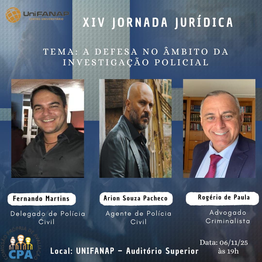 O curso de Direito do UniFANAP realizará, no dia 6 de novembro de 2025, a XIV Jornada Jurídica. As palestras ocorrerão nos períodos matutino e noturno, oferecendo uma oportunidade ímpar para debater temas atuais e promover a integração entre acadêmicos e profissionais da área do Direito.